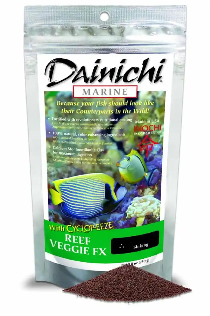 Dainichi’s Reef Veggie FX Premium marine fish food. Pellets are made of freeze-dried and low-temperature cooked ingredients and then encapsulated in a layer of montmorillonite clay to preserve nutrition. A balanced and colour-enhancing diet.
